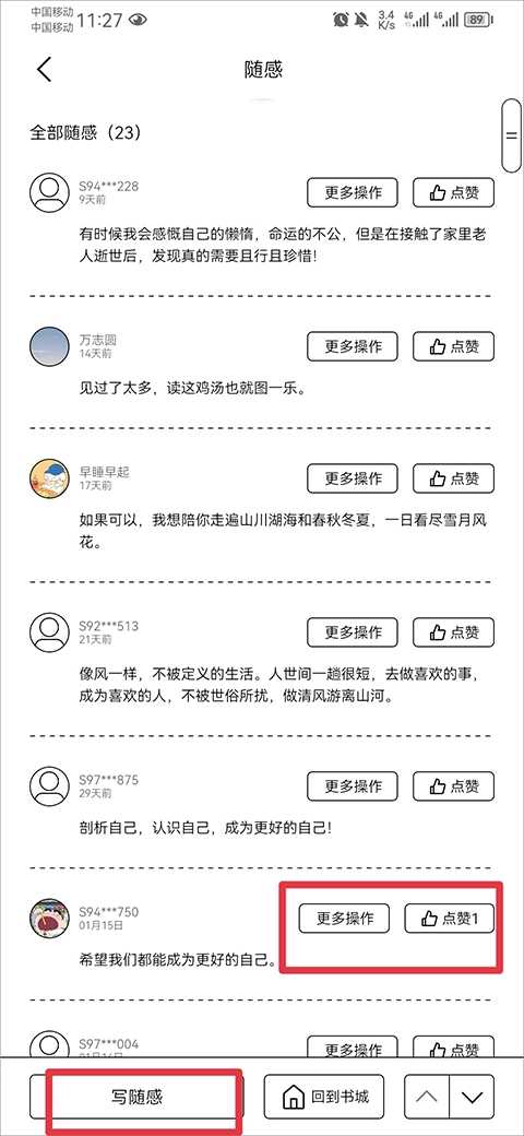 4、当阅读完整本书后,可以为此书籍写随感,也可以对其他用户的随感进行点赞、评论等操作