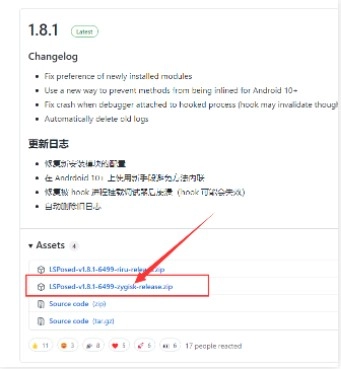 5、在GitHUb 上的 LSPosed 仓库中,箭头所指的 LSPosed-Zygisk 版的模块;随后在Magisk框架中选择【本地安装】,安装到的 LSPosed 模块。