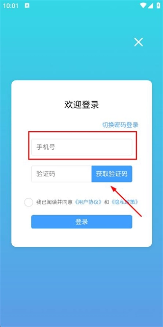 2、在手机登录页面填写手机号,勾选协议后,点击获取验证码。