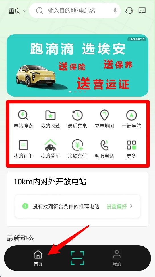 2、点击首页功能区可进入电站搜索、我的收藏、最近充电等实用快捷入口功能。
