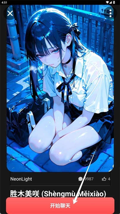 3、如图所示,可任意挑选角色,进入相应界面后点击“开始聊天”按钮。