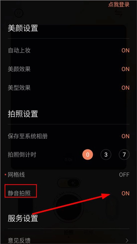 3、打开设置后,可以看到有美颜设置、拍照设置、服务设置等功能栏,打开拍照设置中的静音拍照即可。
