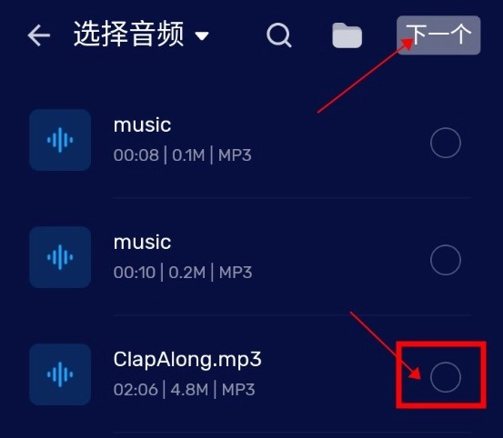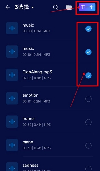 2.在跳转后的页面里,挑选好要合并的音频文件,接着点击右上角的【下一个】按钮。