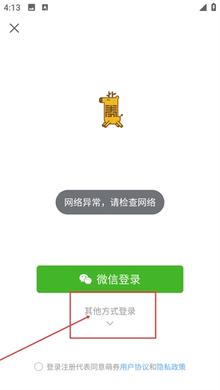 1、在显示【网络异常,请检查网络】的登录界面,点击【其他方式登录】可展开更多登录相关选项。