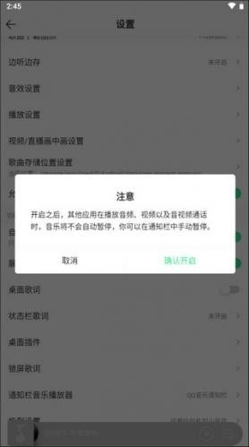 4、开启“允许与其他应用同时播放”开关后,qq音乐将不再会被中断播放,就算你打着微信电话钉钉视频也能继续放歌。