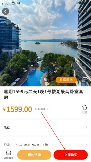 4、在套餐详情页,确认信息后点击【立即购买】按钮,即可进入酒店套餐的下单预订流程。