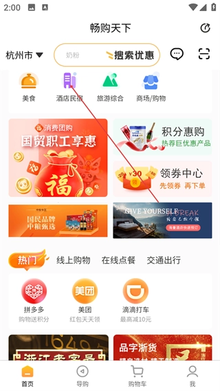 1、进入【畅购天下】首页,点击顶部【酒店民宿】分类入口,进入对应的商家列表页面。