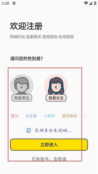 2、进入【欢迎注册】页面,需选择【我是男生】或【我是女生】身份,可选对应标签后点击【立即进入】继续注册。