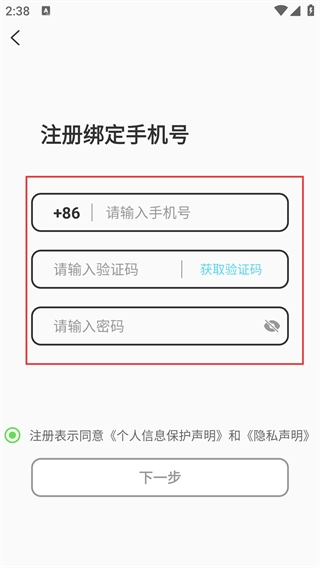 3、进入【注册绑定手机号】页面,需填写【+86-请输入手机号】,获取并填【验证码】,设置【密码】后可点下一步。