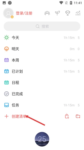 2、进入日程管理页面,找到【创建清单】选项并点击,可开启新清单的创建流程,该页面还展示了今日、本周等时间维度的统计。