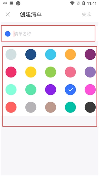 3、进入【创建清单】界面,先在【清单名称】栏输入内容,再从颜色选项中选择偏好的标识色,完成基础配置。