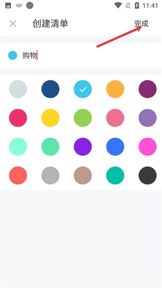 4、在【创建清单】界面填好【购物】作为清单名称、选好颜色后,点击右上角的【完成】按钮,即可完成新清单的创建。