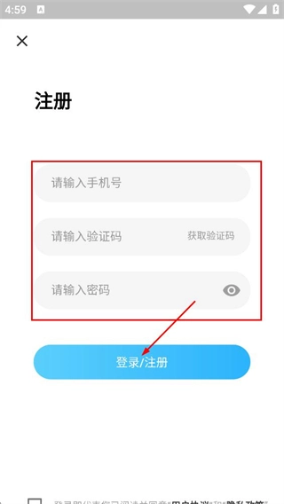 4、填写手机号、获取并填写验证码、设置密码后,点击登录/注册,完成账号注册。