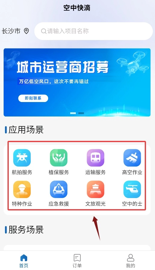 2、首页提供航拍、植保、运输、高空作业与应急救援等服务。