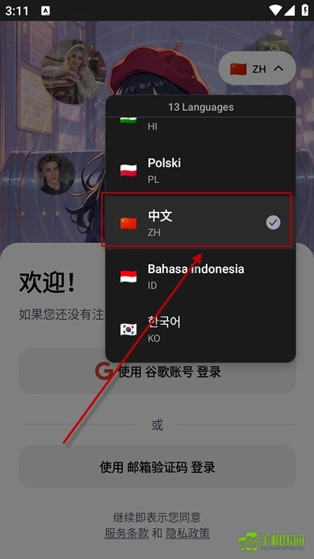 1、在灵宝内安装并打开进入PovChat AI后,找到语言选择相关入口,下滑语言列表,找到“中文(ZH)”选项并选择;