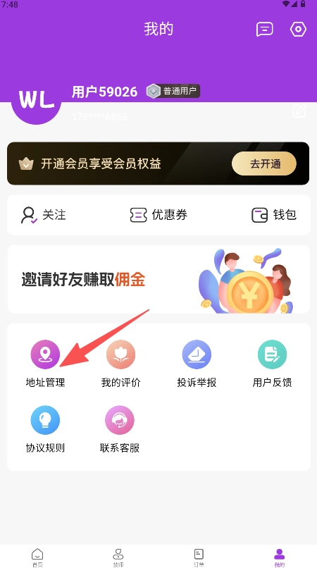 1、进入“我的”页面后,找到并点击“地址管理”的功能入口即可进入对应页面。