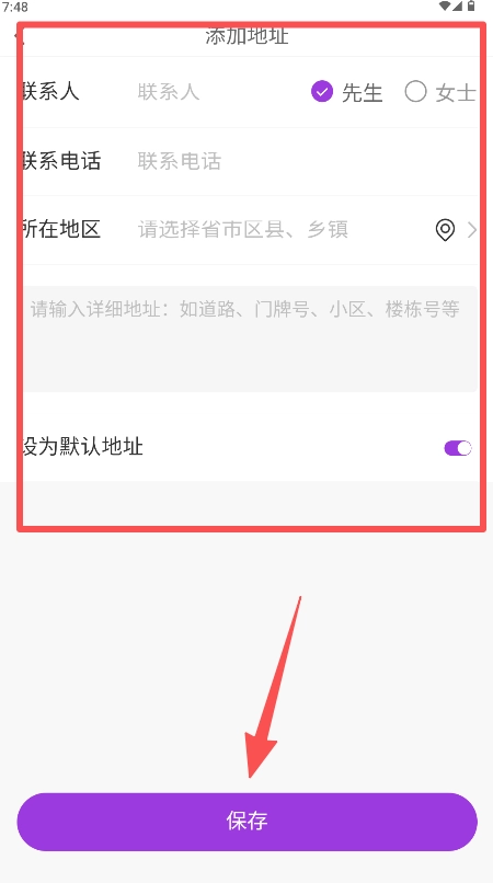 3、依次填写联系人、电话、所在地区与详细地址并点击“保存”。