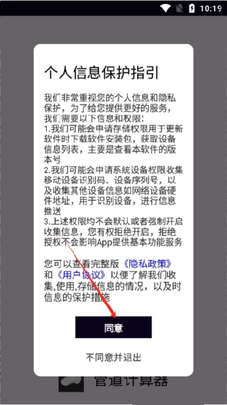 2. 进入软件后,先阅读并同意管道计算器的用户协议。