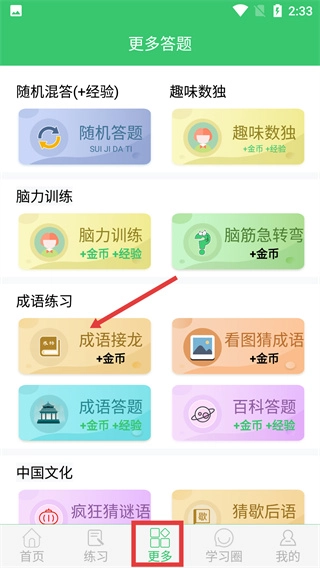 1、进入“更多”页面,在成语练习板块点击“成语答题”选项,进入成语答题的关卡选择界面。