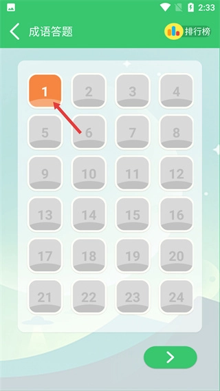 2、在成语答题的关卡选择界面,点击标有“1”的关卡按钮,进入第1关的答题页面。