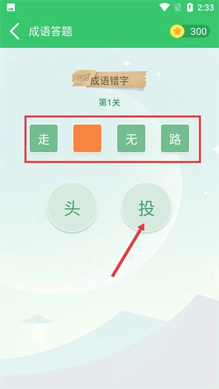 3、在第1关的成语错字答题页面,选择“投”字填入空缺位置,完成该题的作答操作。