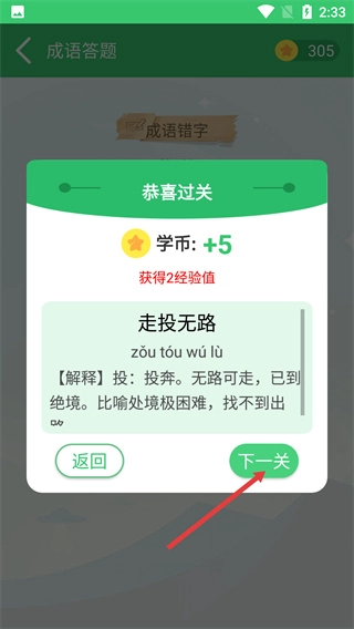 4、答题通关后,在“恭喜过关”界面中点击“下一关”按钮,进入下一个关卡的答题流程。