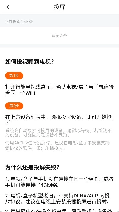 4、接下来会自动搜索附近的投屏设备,你只需从搜索结果列表里挑选对应的电视或盒子设备即可。