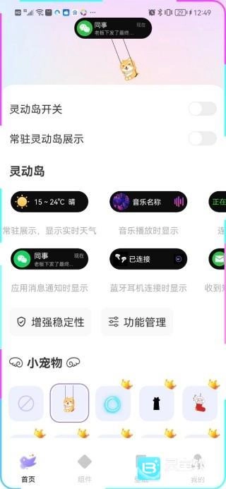 1、在首页能够完成灵动岛的设置,并且可以挑选自己喜爱的小宠物;