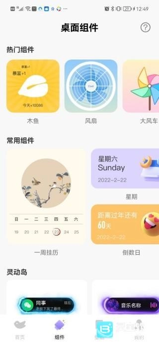 2、组件页面包含热门组件、常用组件以及灵动岛组件。