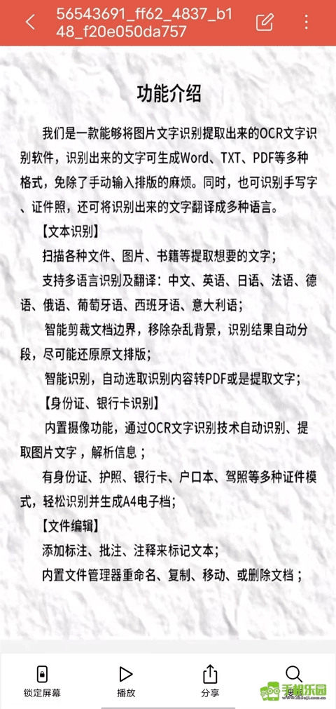 5、保存操作完成后,系统会自动跳转至“我的文件”页面。在此页面中,你可选择并打开任意想要查看的文件。进入文件详情页后,点击右上角的三点图标,会弹出包含打印、投屏、缩略图、设置以及用其他应用打开等功能的菜单,你可根据实际需求选择使用这些功能。此外,你还能点击“编辑”按钮对文件内容进行修改,页面底部还设有锁定屏幕、播放、分享和搜索等实用功能。