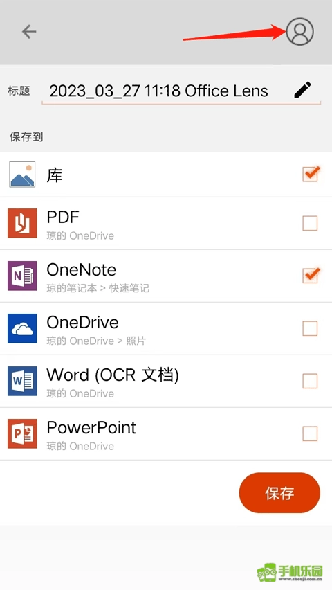 4、接下来,用户可以在此处修改标题,还能选择将内容保存至库、PDF、OneNote、Word(OCR文档)、OneDrive以及PowerPoint等位置。这是一种支持多选的格式,您能够同时把内容保存到多个地方。不过需要注意的是,记得先点击右上角的头像完成登录操作。