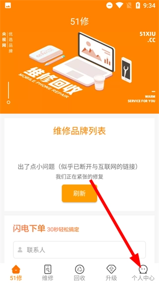 1、进入【51修】首页后,要是【维修品牌列表】出现加载异常的情况,点击【刷新】按钮就能尝试重新获取数据,另外还能查看【闪电下单】的入口。