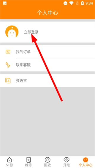 2、点击底部的【个人中心】,进入该页面后,能找到【我的订单】-【联系客服】等相关功能,但在此之前需要先完成【立即登录】这一操作。