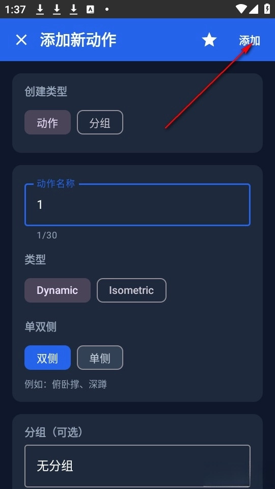 填写完新动作相关信息后点击右上角添加。