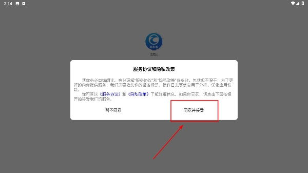 1、当弹出《服务协议和隐私政策》窗口时,请仔细阅读相关条款,随后点击【同意并接受】按钮,完成协议确认流程,即可进入应用。