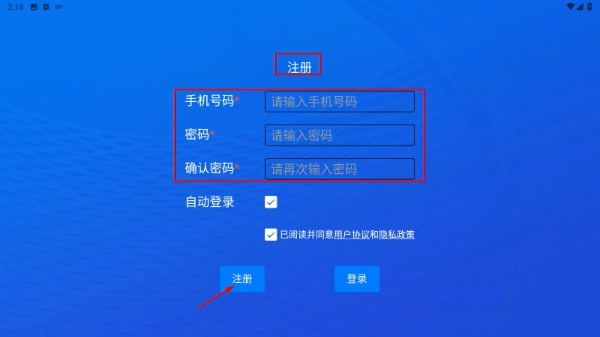 2、进入注册界面,按顺序填写【手机号码】【密码】【确认密码】,勾选相关协议后点击【注册】按钮,即可完成账号创建。