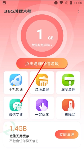 1、打开【365清理大师】的首页后,找到并点击【微信专清】的功能入口,即可对微信垃圾开展专项清理工作。