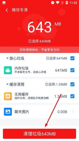 2、进入【微信专清】页面后,系统会自动勾选可清理的垃圾项(像内存垃圾、无用缓存这类),此时点击显示为【清理垃圾643MB】的按钮,就能完成清理操作。