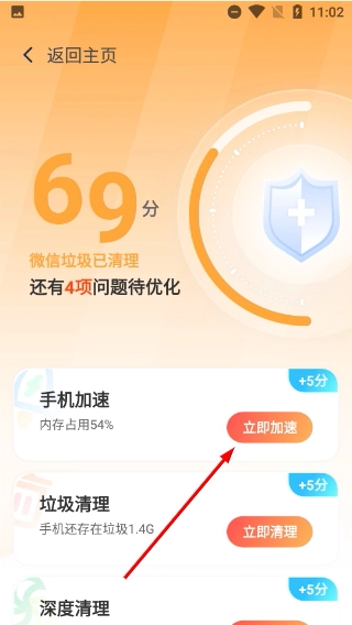 3、清理操作完成后回到主页,找到显示内存占用信息的【手机加速】模块,点击【立即加速】按钮来优化手机的运行状态。