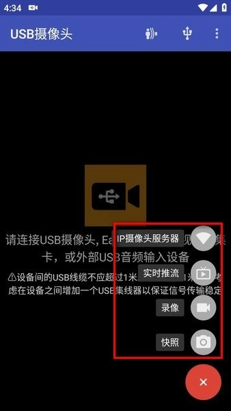 首次使用时,需借助OTG线连接摄像头设备;待设备成功识别后,点击红色功能键即可启动核心操作流程。该软件整合了录像、快照与直播推流三项功能的快捷入口,用户通过右上角的菜单,还能开启画中画等特色功能选项。