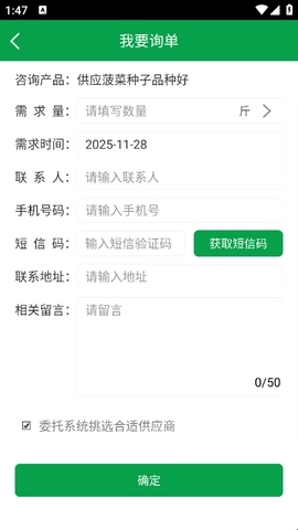 请填写您的个人信息,包括需求量、需求时间、联系电话、地址及留言等内容,供货商即可与您取得联系。
