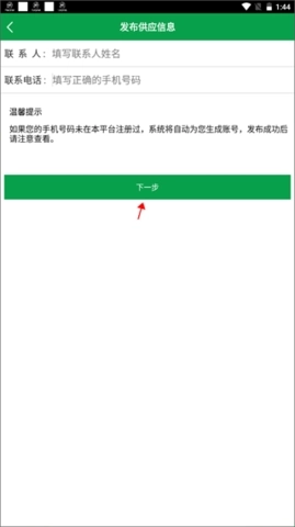 接着在发布报价时填写企业名称、个人姓名以及联系电话,再点击下一步。