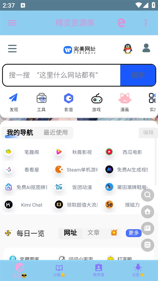 进入首页后,能看到丰富的资源导航板块,涵盖了影视动漫、AI工具等各类内容。