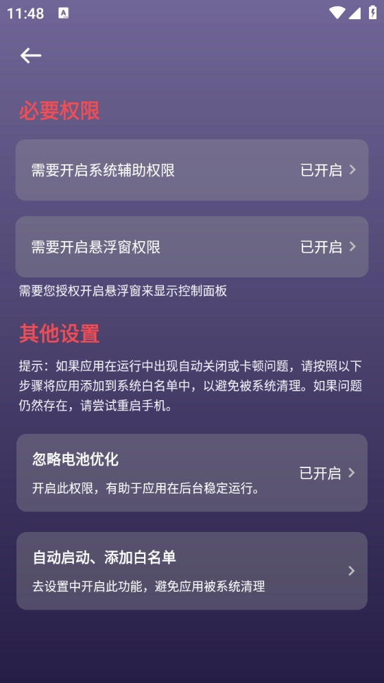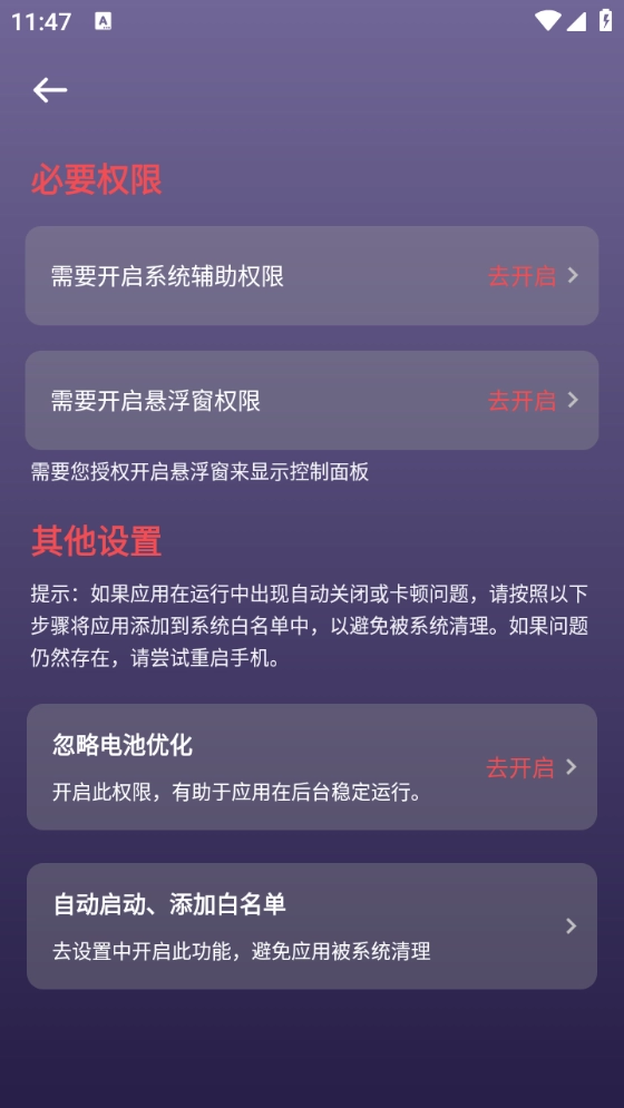 为保障“企鹅自动点击器”的稳定运行,建议您关闭该应用的电池优化功能,不要对其后台活动进行限制,同时开启自动启动权限,以此避免应用被系统自动清理。