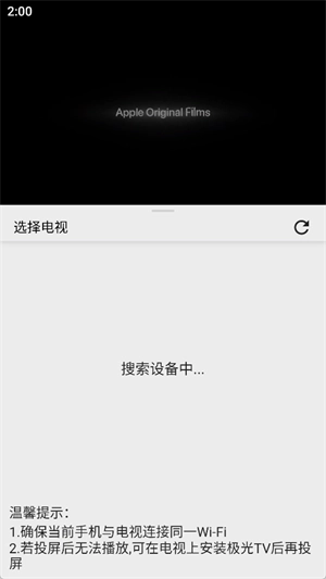 当投屏页面显示时,把投屏设备和手机连接到同一网络,搜索到该设备后点击即可进行投屏。