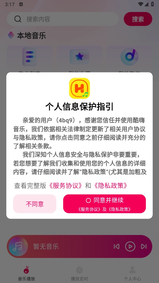 安装酷嗨音乐,同意相关的政策与协议之后打开。
