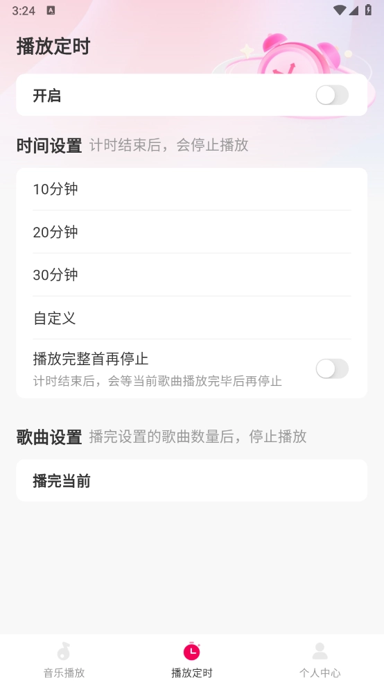 在播放定时设置页面,可以设定歌曲播放时长,到达时长后系统会自动关闭播放。
