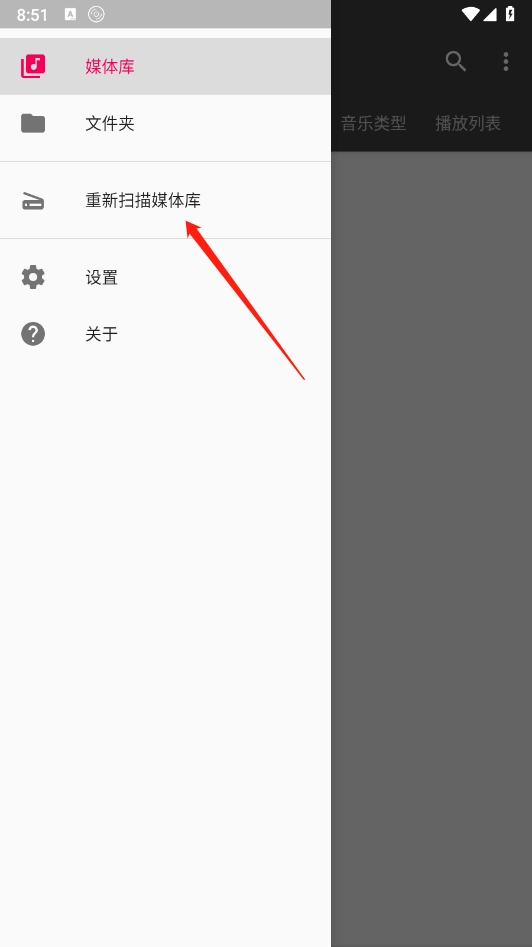 点击左上角的箭头指示标志,点击重新扫描新媒体库。