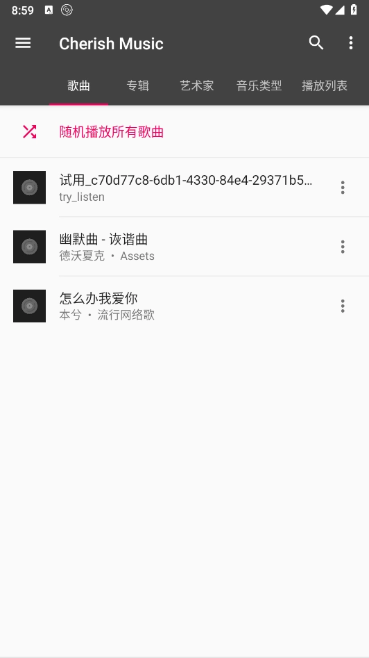 Cherish Music 是一款音乐播放器,它本身不任何音乐资源,需要用户导入本地音乐文件才能使用。这款播放器主打高品质音效播放功能,同时支持多种播放模式,能帮助用户更高效地管理个人音乐曲库,其简洁的界面设计也让操作体验更加流畅。