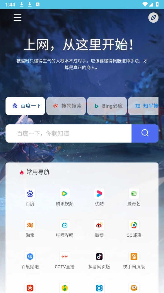 进入首页,可以使用百度、搜狗以及必应等搜索引擎。
